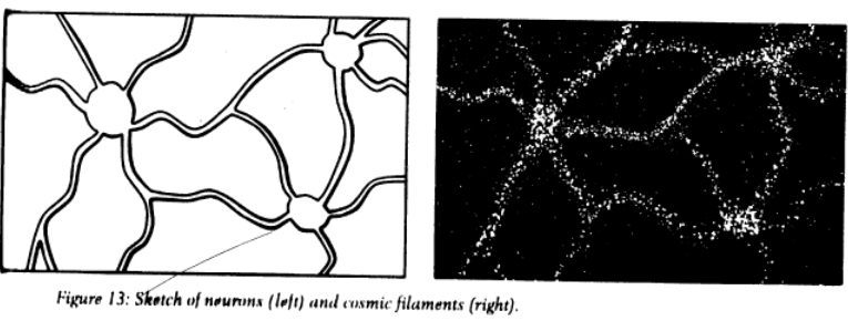 To be more precise, the distribution of matter in the universe looks a little like the connectome, the network of nerve connections in the human brain. Neurons in the human brain, too, form clusters, and they connect by axons, long nerve fibers that send electrochemical impulses from one neuron to another.