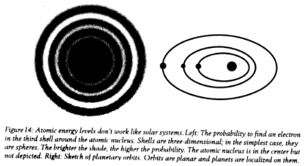 But we know today that atoms aren't little solar systems (figure 14). Electrons aren't small balls that orbit around the nucleus; they have pronounced quantum properties and must be described by wave functions. An electron's position is highly uncertain within the atom, and its probability distribution is a diffuse cloud that takes on symmetrical shapes, called orbitals. The electrons' energy in the orbitals comes indiscrete steps it is quantized. This quantization gives rise to the regularities we find in the periodic table. This doesn't happen for solar systems. Planets in solar systems can be at any distance from the sun. They aren't fluffy probability distributions, the orbits aren't quantized, and there's no periodic table of solar systems. Where does this difference come from?