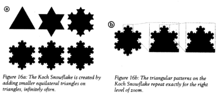 In the previous section, we saw that the laws of nature are not scale free; that is, physical processes change with the size of objects. But there is a weaker form of scale freeness that you may be familiar with: fractals. Take, for example, the Koch snowflake. It's generated by adding smaller equilateral triangles to equilateral triangles, as shown in figure 16a. The shape you get if you continue adding triangles indefinitely is a fractal; the area is finite, but the length of the perimeter is infinite.