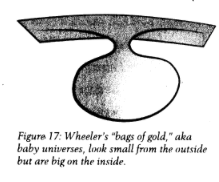 You can circumvent this problem by conjecturing that the inside of our elementary particles has a large volume. Like the TARDIS in Doctor Who, they might be bigger on the inside than they look from the outside. Sounds crazy, I know, but it's indeed possible. That's because in general relativity we can curve spacetime so strongly that it'll form bags (figure 17). These bags can have a small surface aerie., look small from the outside but have a large volume inside. The physicist John Wheeler (who introduced the terms black hole and wormhole) called them "bags of gold." (It was one of his less catchy phrases.)