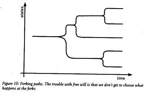 Our life is thus not, in Jorge Luis Borges's words, a "garden of forking paths" where each path corresponds to a possible future and it is up to us which path becomes reality (figure 10). The laws of nature just don't work that way. For the most part, there is really only OnePath, because quantum effects rarely manifest themselves macroscopically. What you do today follows from the state of the universe yesterday, which follows from the state of the universe last Wednesday, and so on, all the way back to the Big Bang.