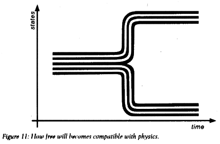 Remember that emergent properties are those that arise in ap-proximate descriptions on large scales when details of the microphysics have been averaged. Figure 11 illustrates how this can be used to make place for free will. On the microscopic level, the paths (white lines) are determined by the initial value-that is, the place they start from on the left. But on the macroscopic level, if you forget about the exact initial conditions and look at the collection of all microscopic paths, the macroscopic path (black outline) forks.